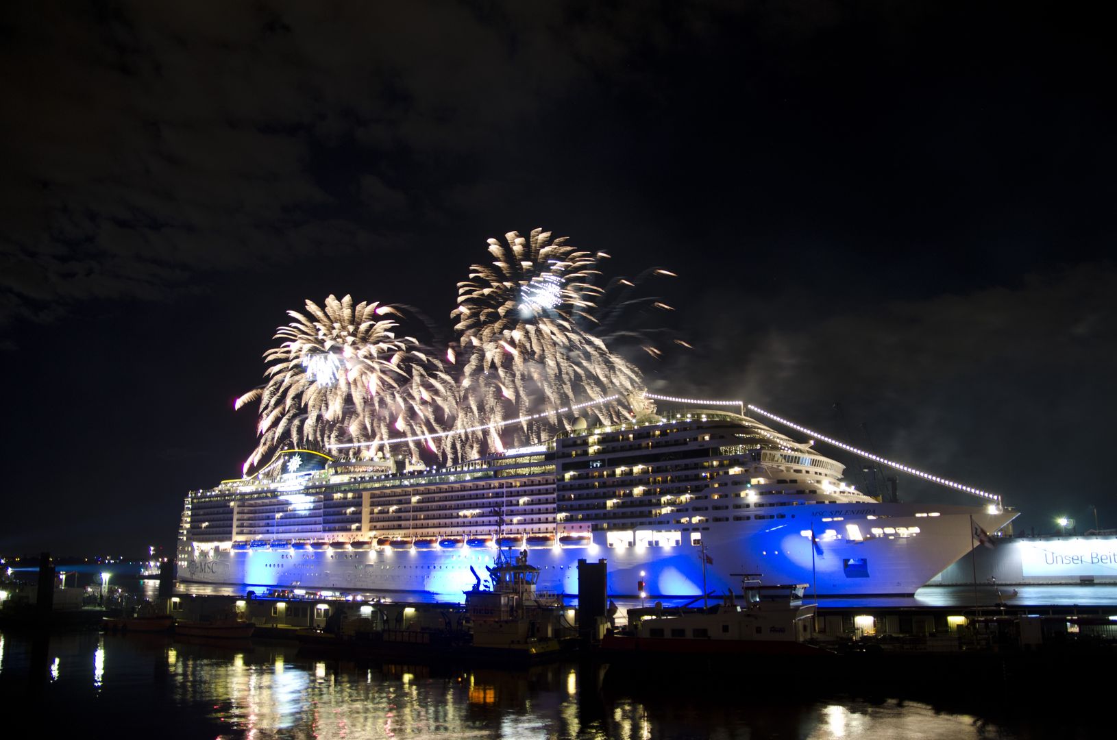 Feuerwerk zum 100. Anlauf eines MSC Kreuzfahrtschiffes in Hamburg. Foto: bergeest