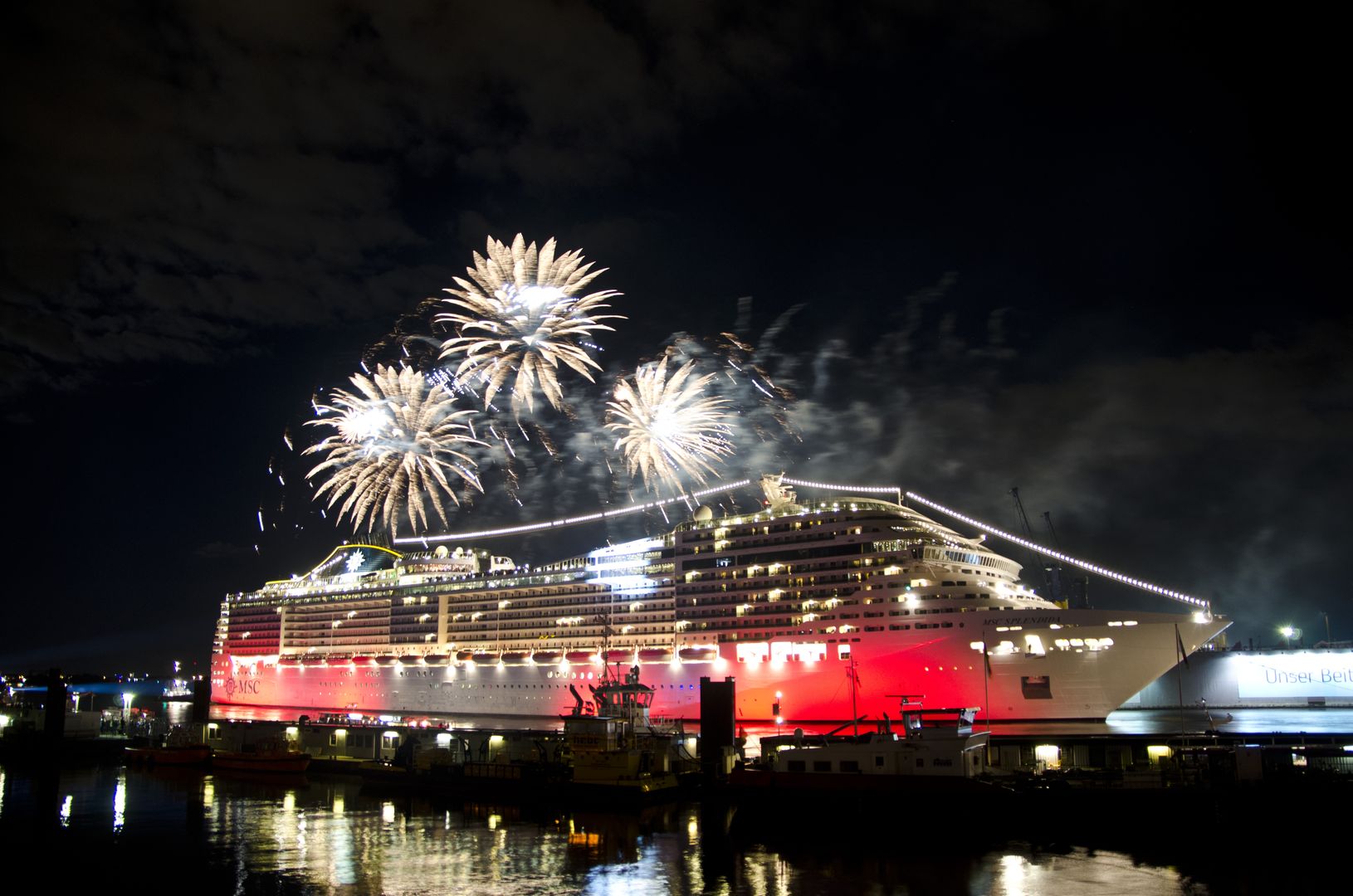 Feuerwerk zum 100. Anlauf eines MSC Kreuzfahrtschiffes in Hamburg. Foto: bergeest
