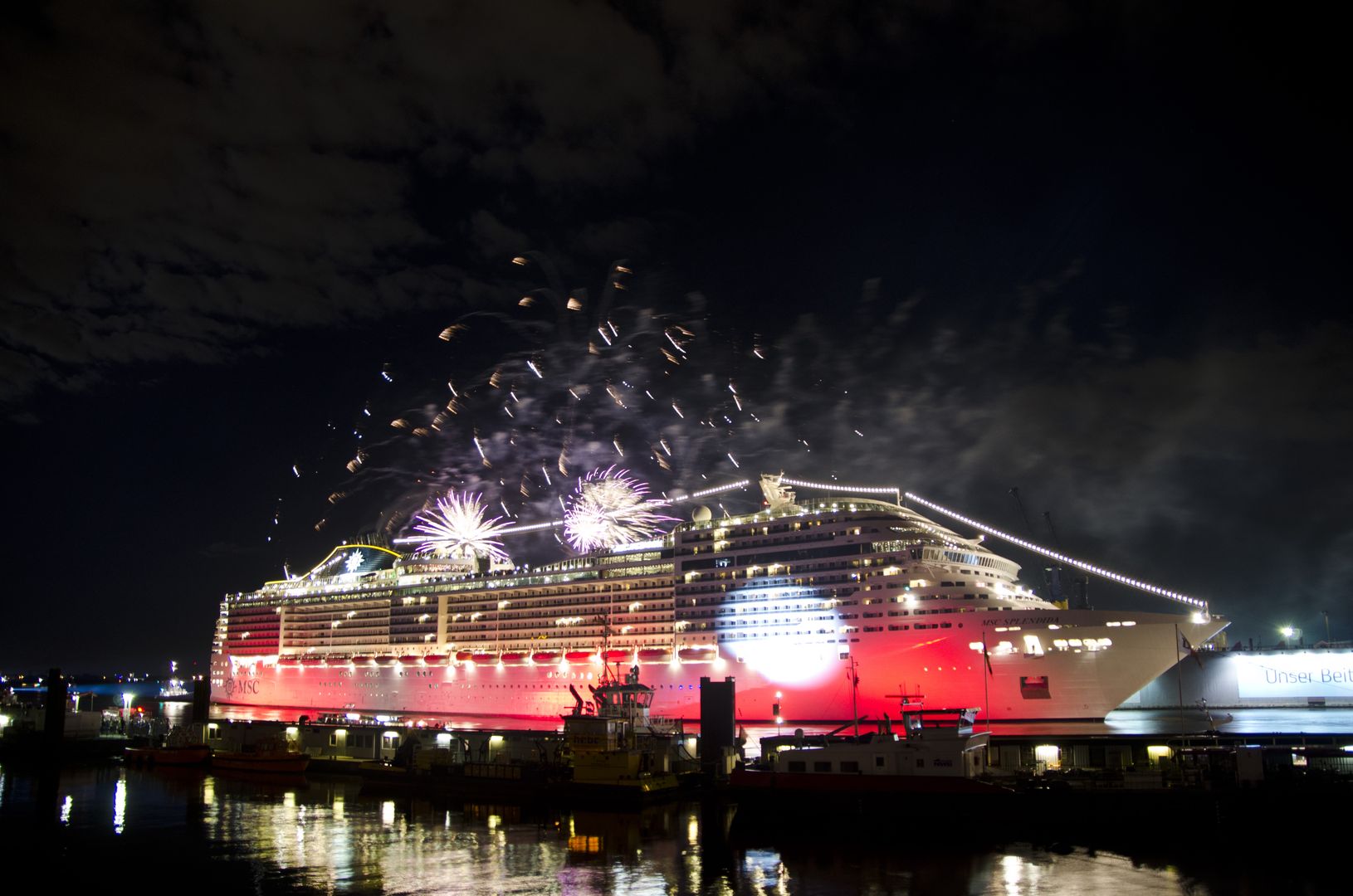 Feuerwerk zum 100. Anlauf eines MSC Kreuzfahrtschiffes in Hamburg. Foto: bergeest