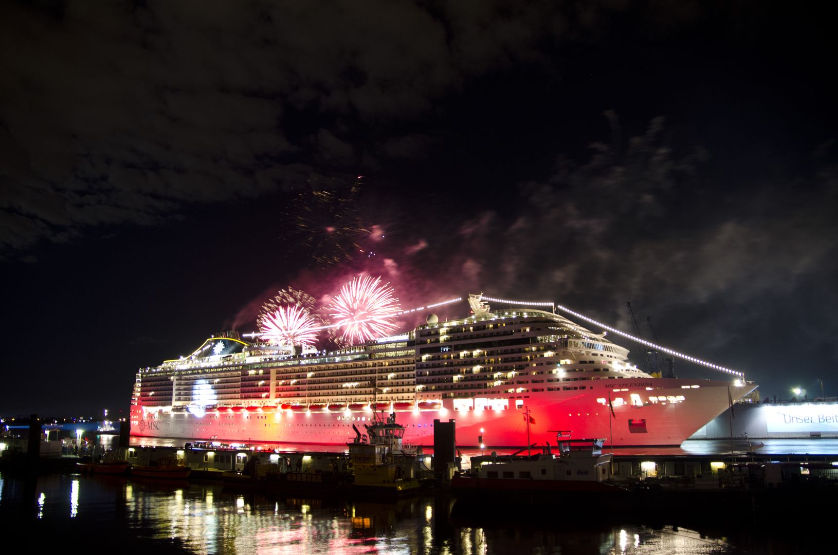 Feuerwerk zum 100. Anlauf eines MSC Kreuzfahrtschiffes in Hamburg. Foto: bergeest