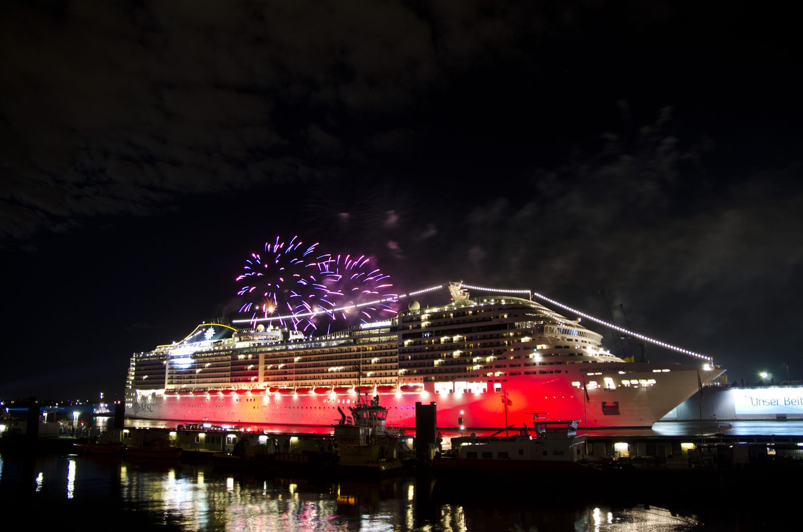 Feuerwerk zum 100. Anlauf eines MSC Kreuzfahrtschiffes in Hamburg. Foto: bergeest