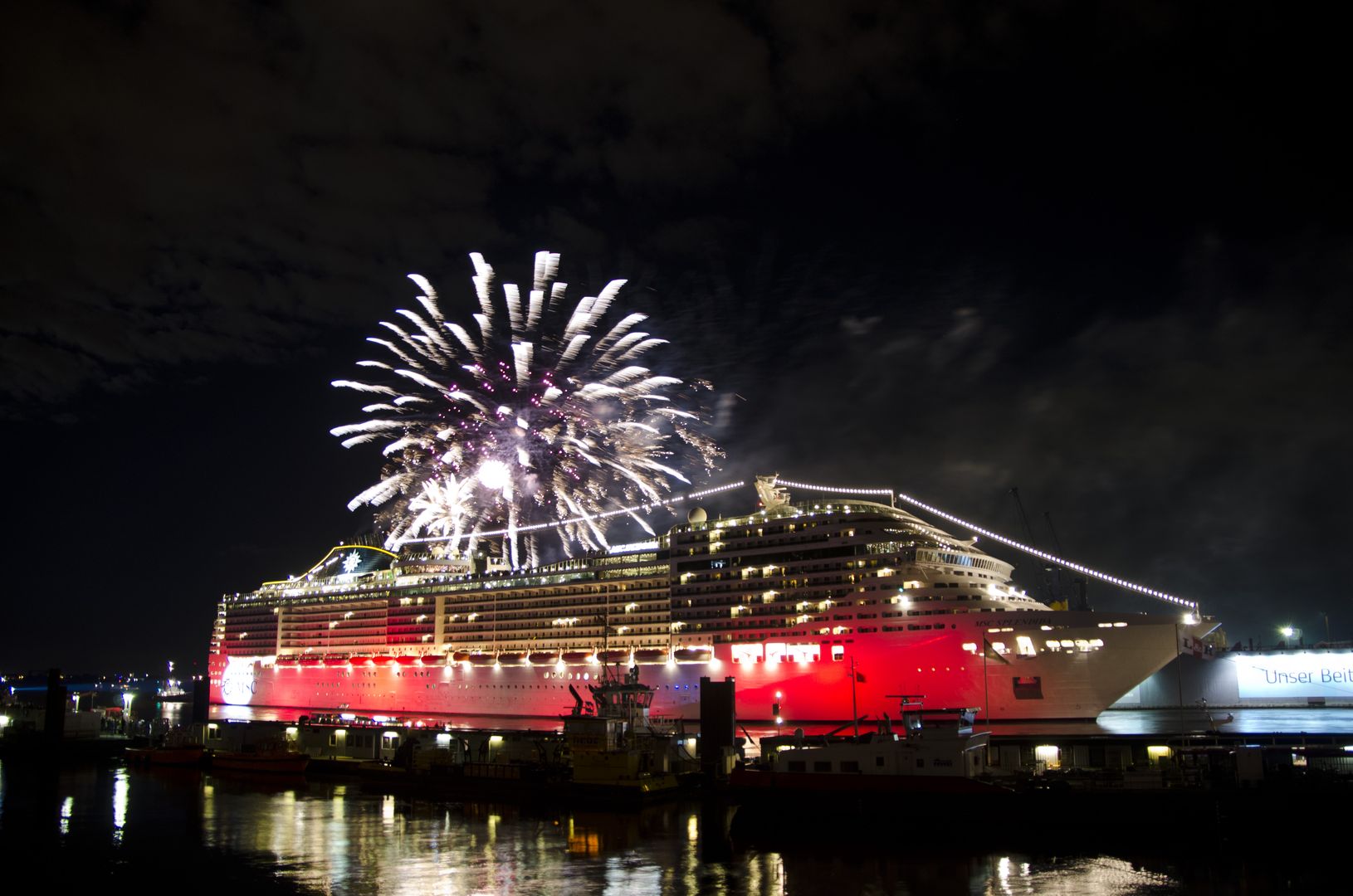Feuerwerk zum 100. Anlauf eines MSC Kreuzfahrtschiffes in Hamburg. Foto: bergeest