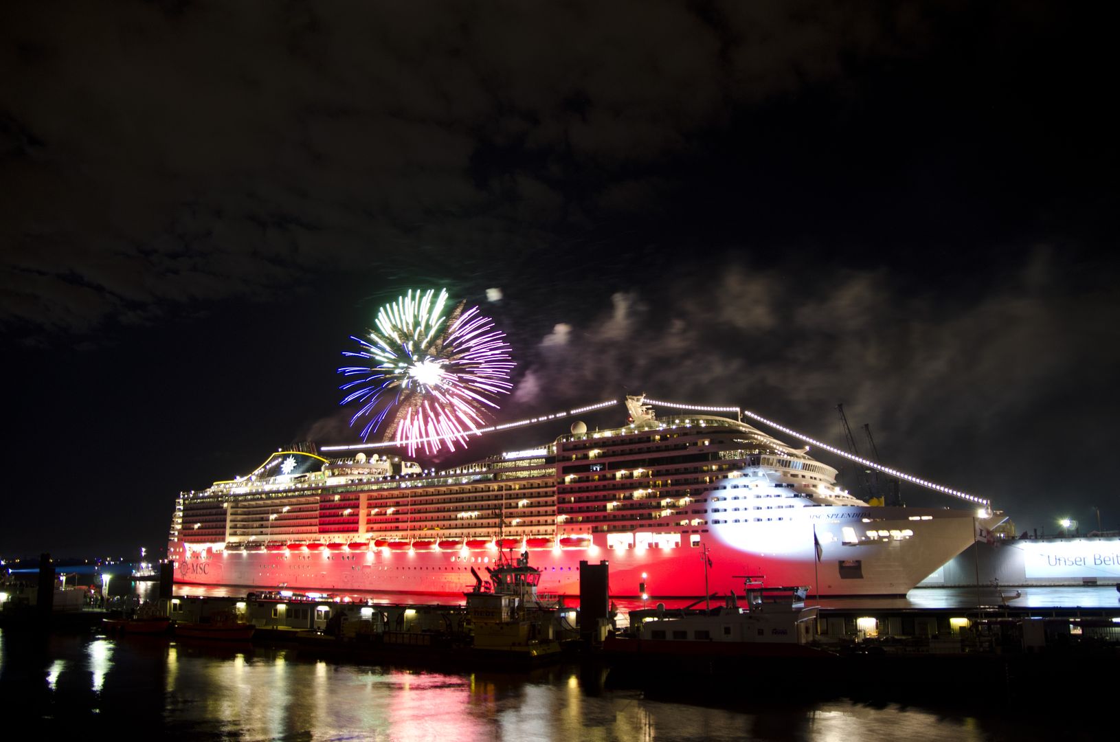 Feuerwerk zum 100. Anlauf eines MSC Kreuzfahrtschiffes in Hamburg. Foto: bergeest