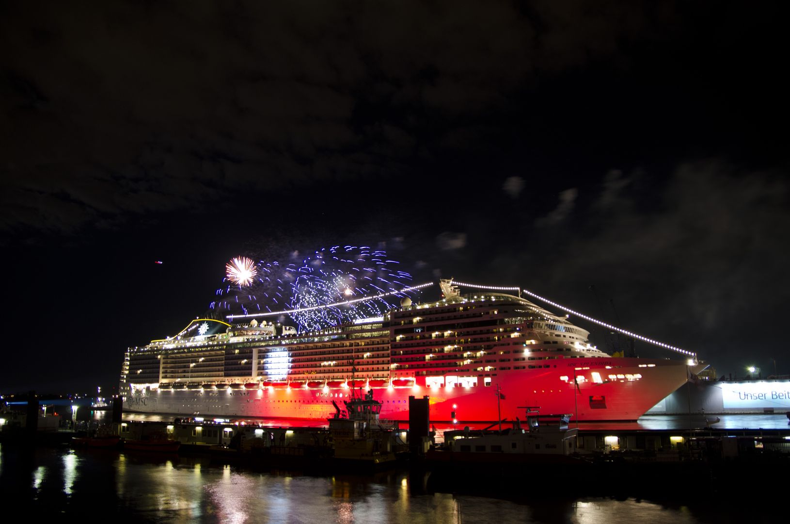 Feuerwerk zum 100. Anlauf eines MSC Kreuzfahrtschiffes in Hamburg. Foto: bergeest