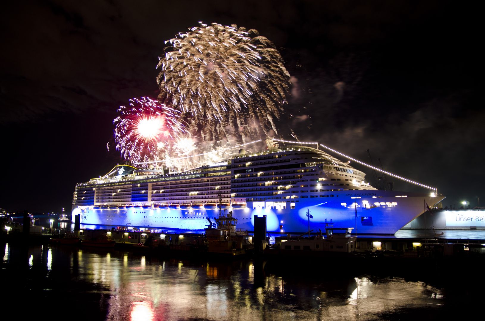 Feuerwerk zum 100. Anlauf eines MSC Kreuzfahrtschiffes in Hamburg. Foto: bergeest