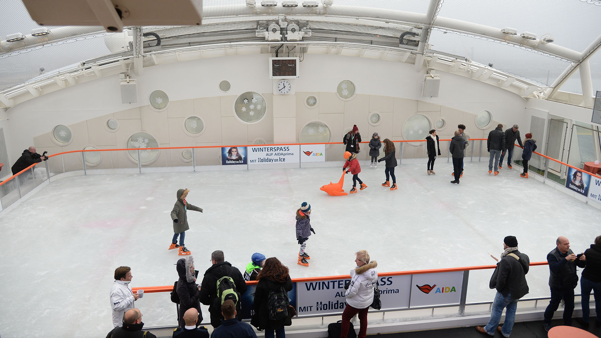 Mehr als zwei Wochen haben zahlreiche Techniker und Mitarbeiter auf dem Sportsdeck der AIDAprima gearbeitet. Nun steht die erste Eisbahn auf einem deutschen Kreuzfahrtschiff. Durch Workshops und einer Kooperation mit der bekannten Eisshow „Holiday on Ice“ werden die Gäste an Bord selbst schnell zu echten Eisprinzessinnen. Einen ausführlichen Artikel zur Eisbahn an Bord der AIDAprima findet ihr hier.