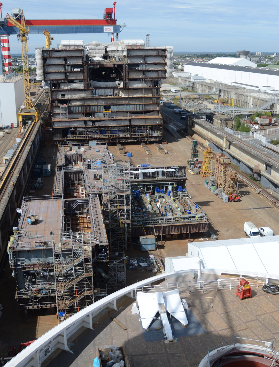 Im Vorderschiff bekommen die 5.714 Passagiere des Schiffes einen 180 Grad Ausblick auf das offene Meer und den Bug. Im Baudock liegen schon Sektionen des noch namenlosen Schwesterschiffes der „Harmony of the Seas“. Foto: lenthe/touristik-foto.de
