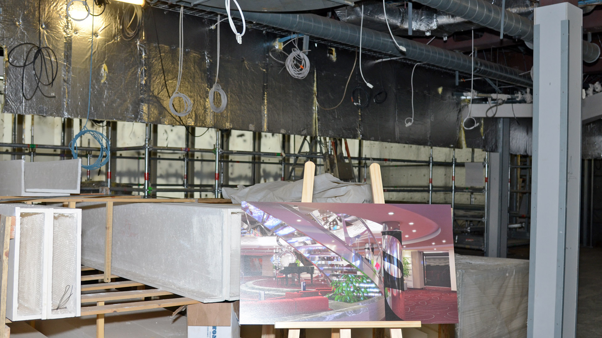 Die Rezeption auf Deck 6 lässt sich bisher nur erahnen. Kabel hängen von der Decke und erste Counterinstallationen sind bereits zu erkennen. Foto: lenthe/touristik-foto.de