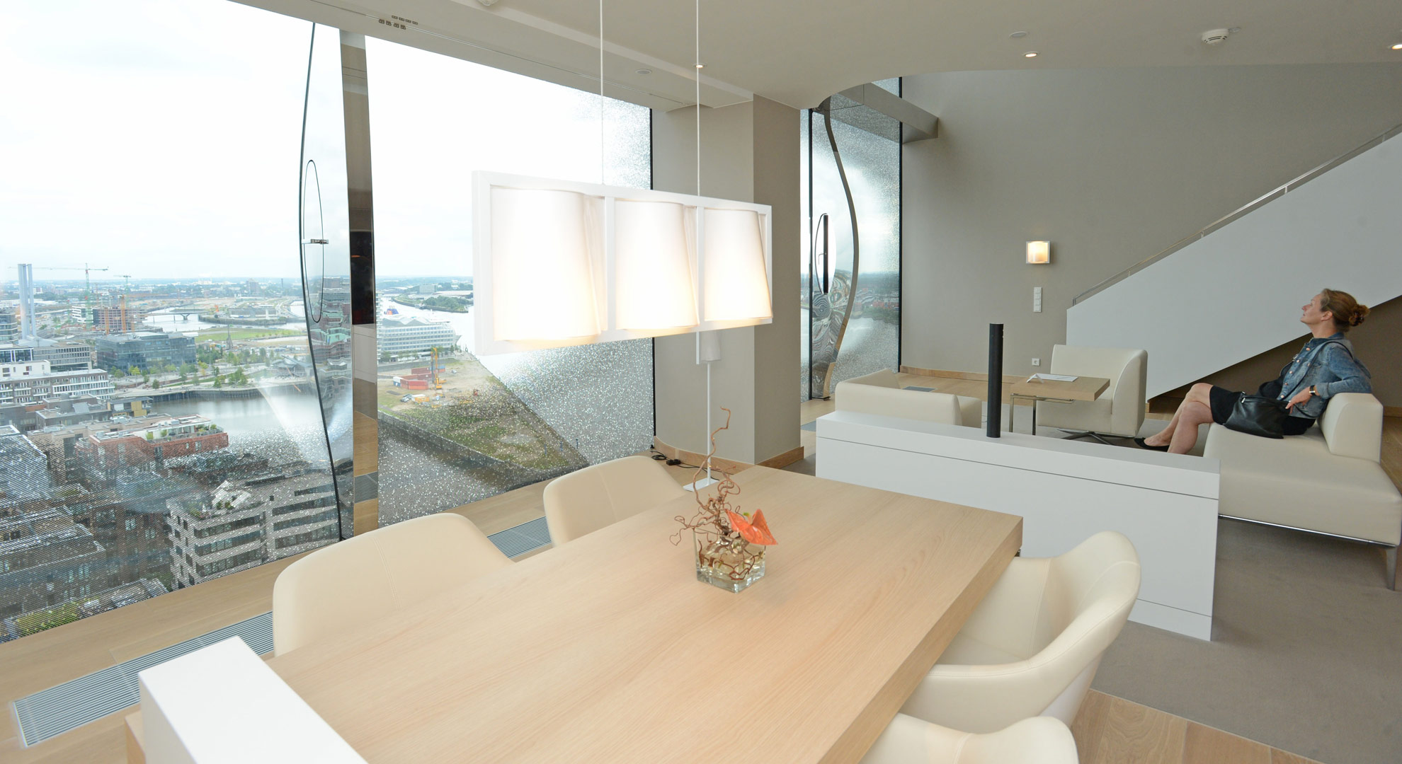 Im Erdgeschoss der Maisonette Suiten gibt es einen großen Tisch und eine Sitzecke, Bett und Bad sind über eine Treppe zu erreichen. Von hier haben die Gäste einen Blick auf das Cruise Center Hafen City Hamburg. Foto: lenthe/touristik-foto.de