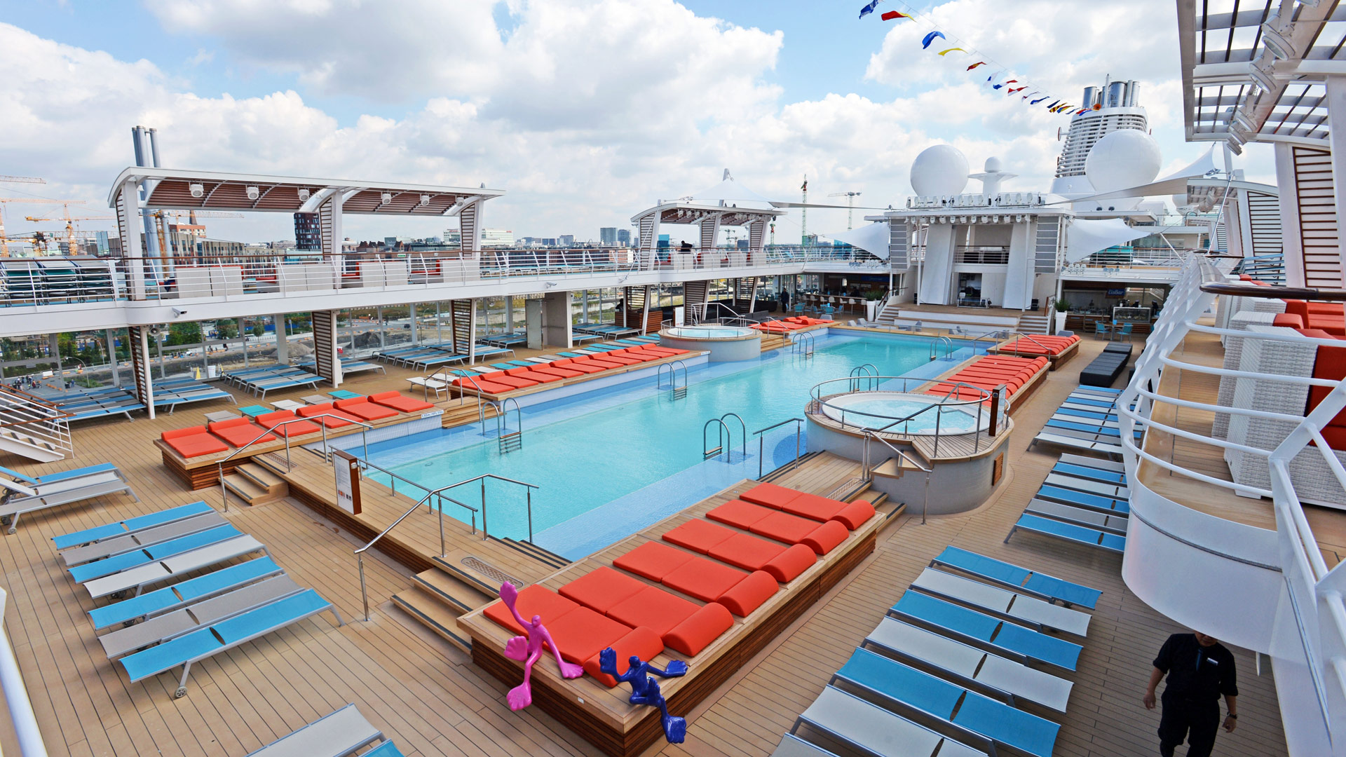 Freibad-Feeling auch deshalb, weil der Indoor-Pool verschwunden ist. Auf der Fünf gibt es dafür einen weiteren, wenn auch kleineren Außenpool. Dieser eignet sich vor allem zum chillen, auf den teilweise im Wasser angebrachten Liegestühlen. Es entsteht hier der Eindruck einer modernen Grotte, mit ganz viel Ruhe und Platz zum entspannen. Maximal 25 Gäste sollen den Bereich auf einmal nutzen können, so steht es zumindest in der Poolordnung. Der Außenpool lässt aber auch befürchten, dass wir das Schiff in Nordeuropa künftig nicht mehr so oft zu sehen bekommen. Es ist eher für wärmere Gefilde ausgelegt, also im Sommer Mittelmeer und im Winter die Karibik. Mehr in unserer Bildergalerie.