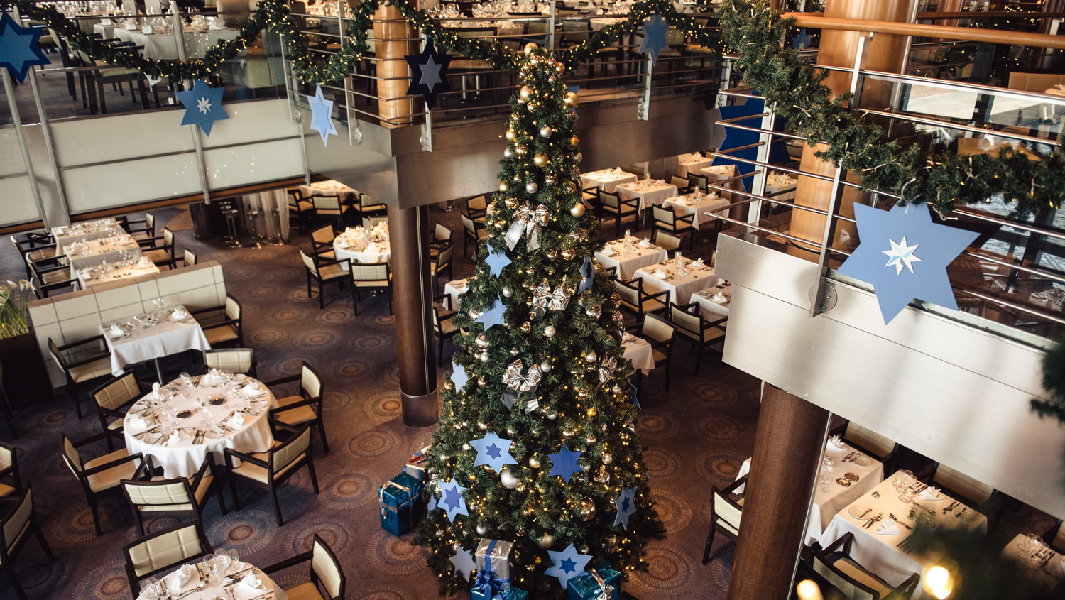 Die Mein Schiff 2 befindet sich während der Feiertage auf einer Reise um die kanarischen Inseln. Das Atlantik Restaurant ist festlich geschmückt. Foto: TUI Cruises